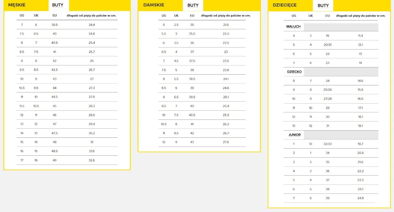 - Rozmiarówki butów dziecięcych różnią się znacząco między producentami, dlatego zawsze należy sprawdzać tabelę konkretnej marki.